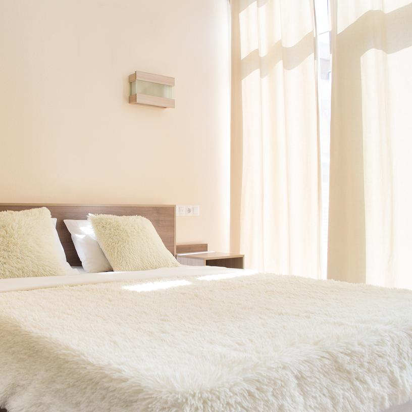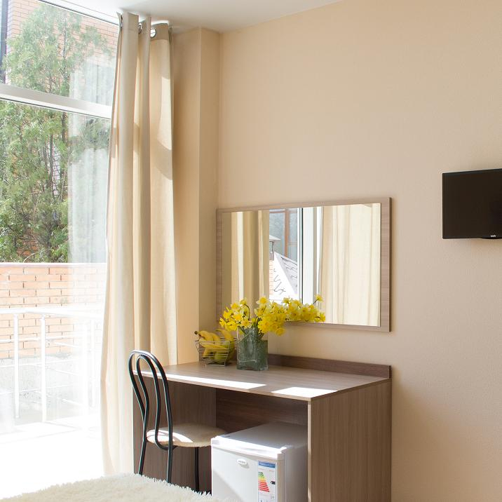 В номере: ТВ, холодильник, кондиционер, чайный набор посуды, набор мебели (туалетный столик, вместительный распашной шкаф, прикроватные тумбочки), фен, сейф.