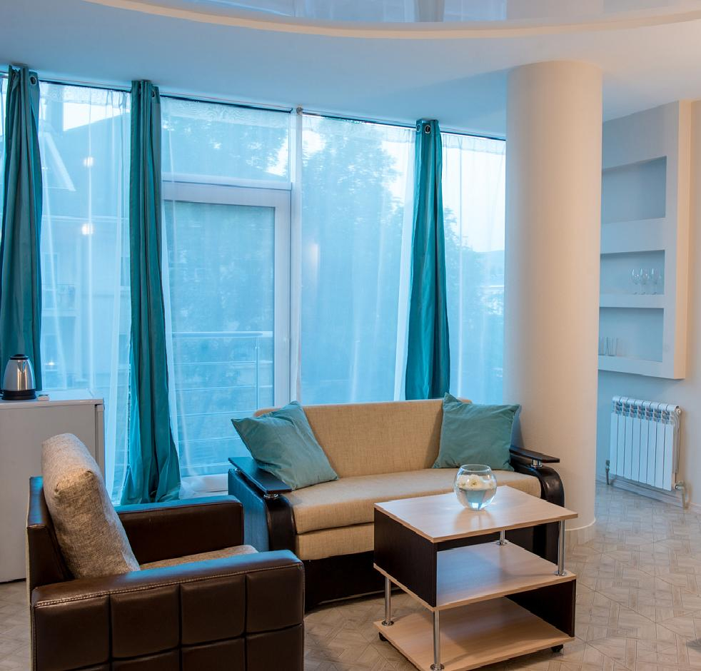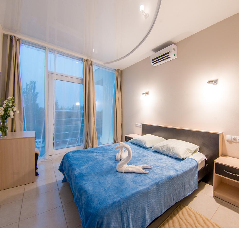 В номере: ТВ, холодильник, кондиционер, микроволновая печь, чайный набор посуды, набор мебели (туалетный столик, журнальный столик, вместительный шкаф-купе, напольная вешалка, прикроватные тумбочки, уютное кресло, два кресло-стула, пуф), фен, сейф.