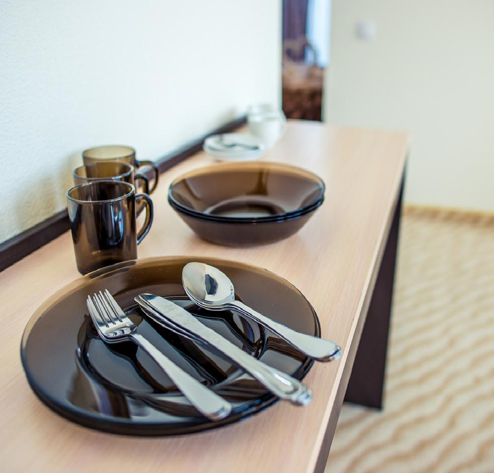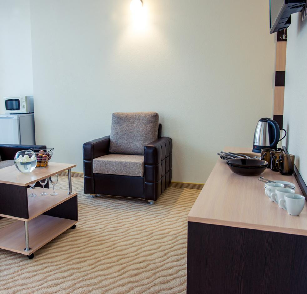 В номере: ТВ, холодильник, кондиционер, микроволновая печь, чайный набор посуды, набор мебели (туалетный столик, журнальный столик, стол письменный, вместительный шкаф-купе, вешалка с багажницей, прикроватные тумбочки, уютное кресло, два кресло-стула, пуф), фен, сейф.