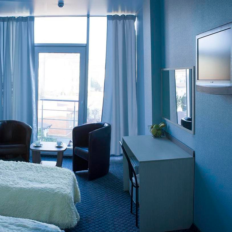 В номере: ТВ, холодильник, кондиционер, чайный набор посуды, набор мебели (туалетный столик, вместительный распашной шкаф, прикроватные тумбочки, кофейный столик с уютными креслами), фен, сейф.